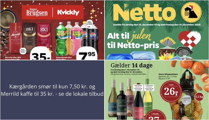 Hos SuperBrugsen kan du få Merrild eller BKI formalet kaffe til kun 35 kr. pr. pose (350-400 g). Tilbuddet gælder fra fredag den 12. december til torsdag den 18. december, og der er en begrænsning på 6 poser pr. kunde.